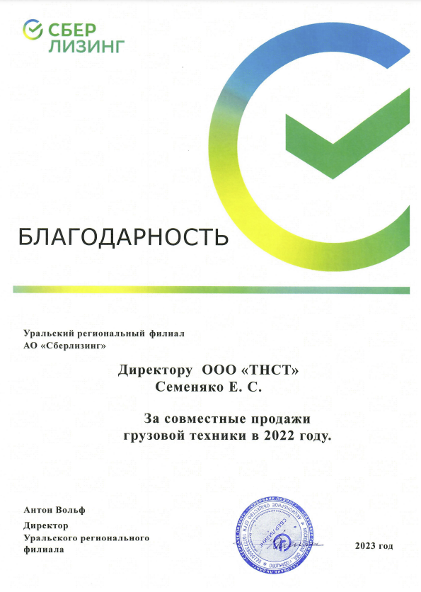 Благодарность за совместные продажи грузовой техники в 2022 году